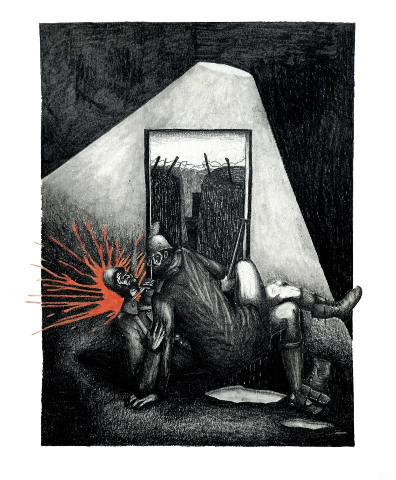 Langs mij, ik besef het me nu pas, een vijandelijk gezicht. Zijn buik, doorklieft door een zwaard.